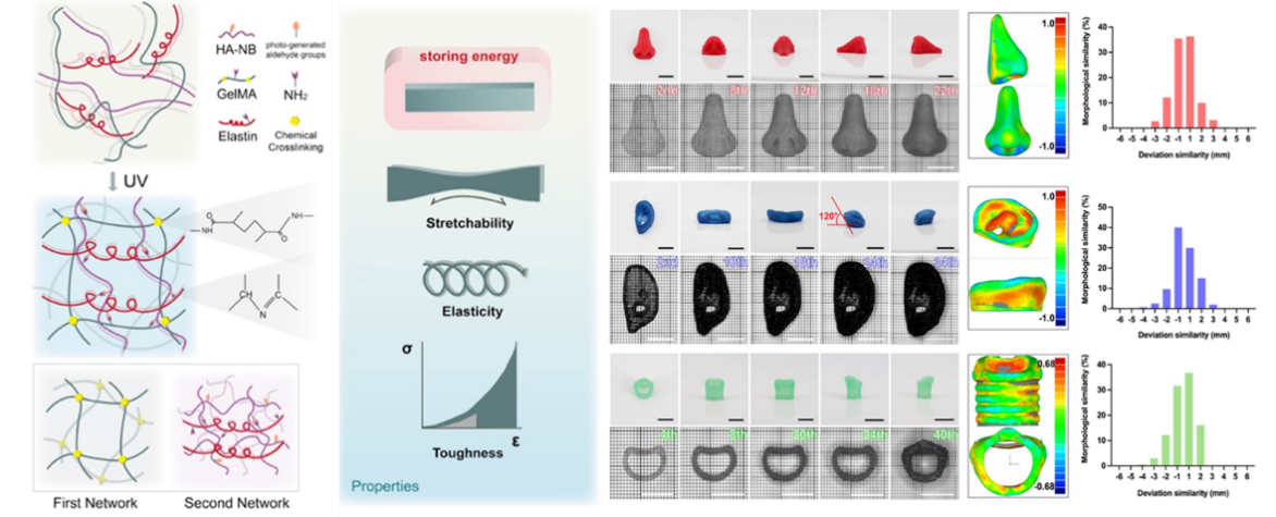 该研究团队应用纯天然聚合物甲基丙烯酰明胶GelMA、邻硝基苄基接枝透明质酸HA-NB和猪主动脉中提取的弹性蛋白Elastin混合构成双网络水凝胶体系。该凝胶体系中GelMA通过自由基聚合形成第一层网络,Elastin和HA-NB通过动态希夫碱反应形成第二层网络,同时两层网络之间进一步通过稀疏的GelMA和HA-NB中醛基的交联(Dual-crosslinking)加固(见图1)。通过对其机械性能的详细表征显示,水凝胶韧性高达45.39 kJ·m-3,能承受约80% 的压缩变形而不破裂,在170%的应变变形后仍可恢复到原来的结构,重复100次机械加载循环,也能快速恢复到原来的形状。证实水凝胶中双交联双网络结构特点、HA-NB/Elastin的可逆性动态交联模式及弹性蛋白分子链的高度卷曲特性赋予水凝胶优异的弹性、韧性及可拉伸性能。该温敏水凝胶还具有优异的可挤出打印性能,可以打印出分辨率较高的耳、鼻、气管等各种复杂结构。进一步结合细胞打印表明该水凝胶体系能够促进软骨细胞的粘附、增殖、表型维持和弹性软骨组织的再生,证实纯天然聚合物属性以及弹性蛋白的存在可促进生物打印组织的细胞相容性及组织再生。